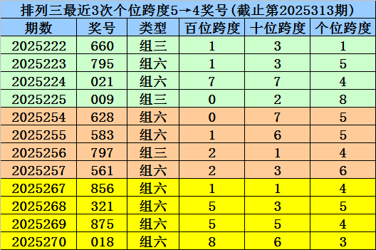末位跨度分析:前3期末位奖号为4-9-5,最近两期末位奖号跨度为5、4,末位奖号跨度历史上连续两期开出5、4的现象共94次,其最近两次奖号为:
