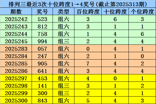 第2025297-第2025299期奖号:453、141、300,其下期奖号为:843,中位号码跨度为5;