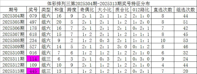 开奖公告:体彩排列三第2025313期开出奖号:445。组三,无重号,奇偶比1:2,大小比1:2,012比0:2:1,和值13,跨度1。