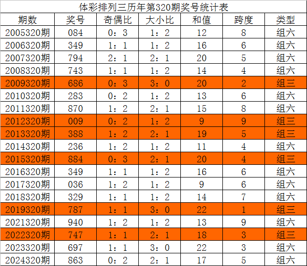 体彩排列三历年第320期开出奖号分别为:084、349、794、743、686、283、870、009、388、236、884、349、036、329、787、940、747、697、863。统计详见下表: