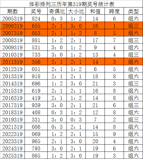 排列三第2025319期奖号为865,奇偶比为1:2,大小比为3:0,和值为19,跨度为3。