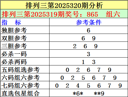 开奖回顾:排列三第2025319期开出奖号:865。其中奖号大小比为3:0,奇偶比为1:2,012路比为1:0:2,和值为19,跨度为3。