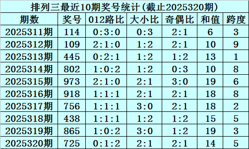 上期回顾:排列三2025320期奖号为725,奇偶比为2:1,大小比为2:1,跨度为14。