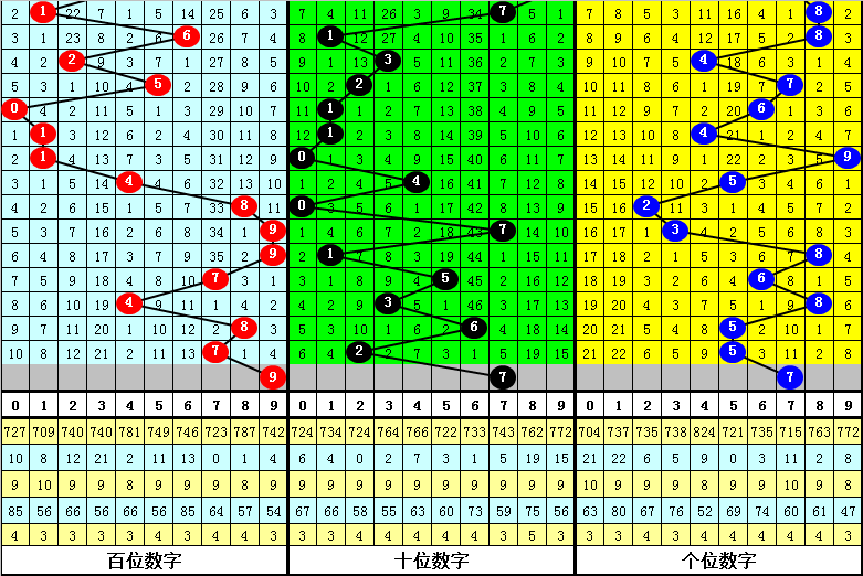 百位:上期开出7,近10期012路比为2:6:2,其中1路号遗漏1期再出,本期放弃1路号,关注0路号,看好9。