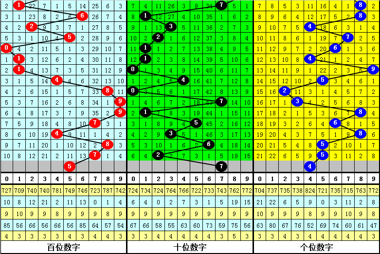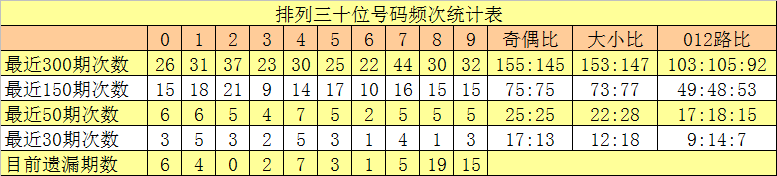 十位号码:前50期走势最活跃的号码为:4开出7个,0、1开出6个;走势最冷的号码为:6开出2个,3开出4个,2、5、7、8、9开出5个。十位号码012路比开出17:18:15,大小比开出22:28。本期十位排除两码:2、3,参考号码1、5、7,胆码关注7。