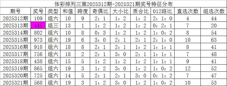 开奖公告:体彩排列三第2025321期开出奖号:568。组六,有重号:5,奇偶比1:2,大小比3:0,012比1:0:2,和值19,跨度3。