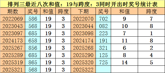 开奖回顾:体彩排列三第2025321期奖号为:568。和值为:19,跨度为:3。