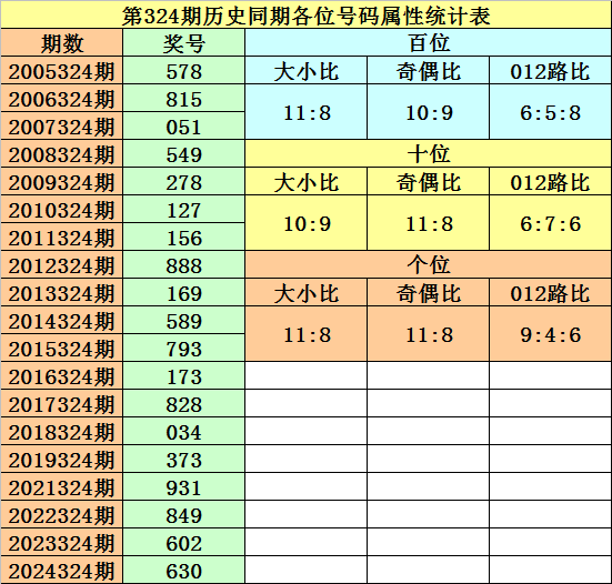 在第324期历史同期开奖中,号码0-9出现频次从高到低分别为:号码8→10次;号码1、3→7次;号码5、7、9→6次;号码0、2、6→4次;号码4→3次。一般来说,表现最热的号码:138+579中至少出现1个奖号。同时奖号不会全部出现在表现最冷的号码中。