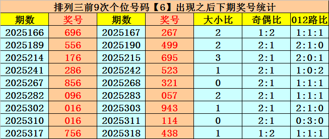 个位号码:上期奖号为大号、偶数、0路号码:6,历史上个位号码6共开出736期,前一次出现在第2025317期,上期遗漏7期再出。