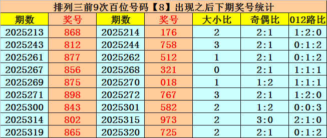 百位号码:百位上期奖号为0路、偶数、大号:8,历史上百位号码8共开出788期,前一次开出期数在第2025319期,上期奖号隔5期再次开出。