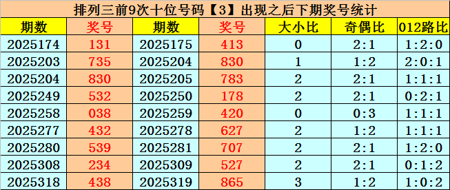 在十位前9次出现号码3后,其下期奖号分别开出:1-3-8-7-2-2-0-2-6,其中奖号个数奇偶比是3:6,大小比是3:6,012路比是3:2:4。