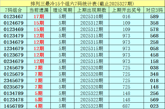 (1)在排列三已开出的7451期奖号中(统计截止第2025327期),目前7码组六遗漏值最大的组合为:0123467,本期遗漏17期;