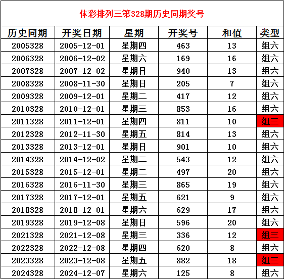 2025年12月8日排列三第328期开奖,历史同期分别开出奖号: