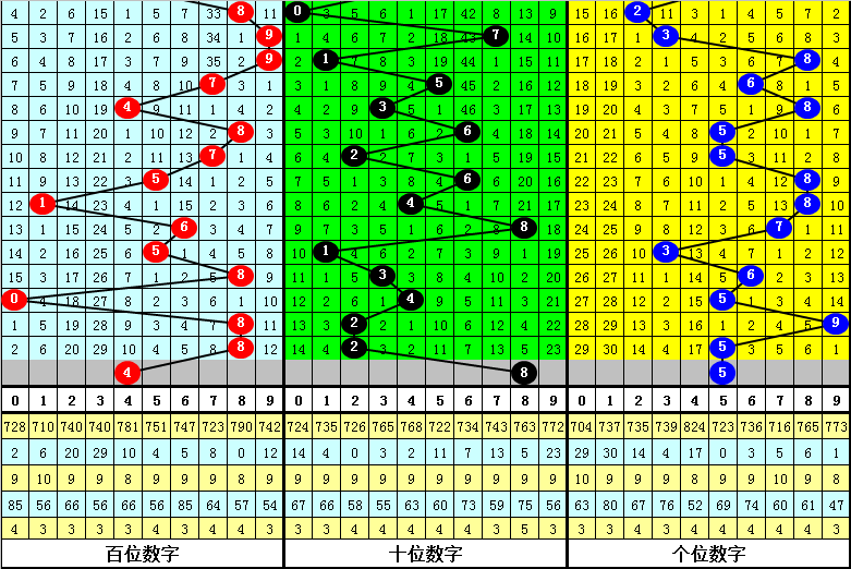 百位:当前遗漏最大的号码为3,遗漏29期,历史上该号最大遗漏为56期,本期百位继续排除号码3。