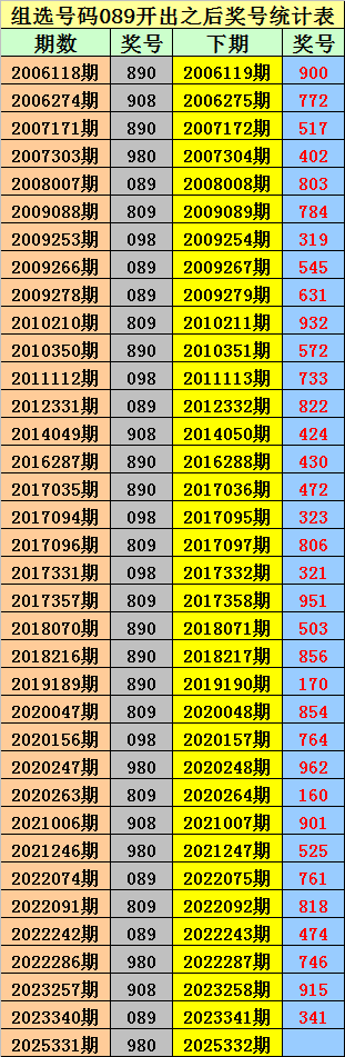 排列三组选089出现之后下期分别开出:900、772、517、402、803、784、319、545、631、932、572、733、822、424、430、472、323、806、321、951、503、856、170、854、764、962、160、901、525、761、818、474、746、915、341。