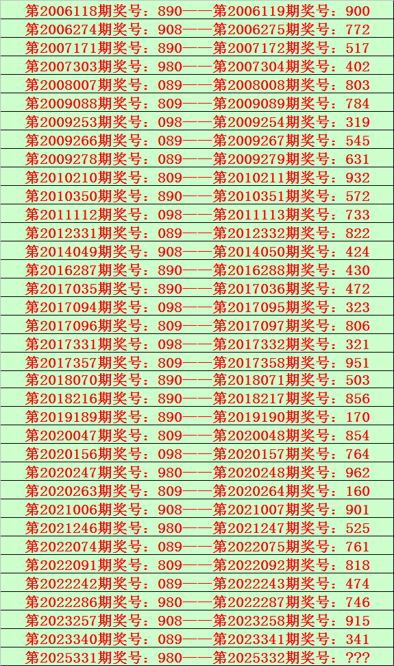 排列三第2025332期开奖日期:2025年12月12日,历史上第332期已开出了19次奖号,历年同期号码分别为:187、020、664、900、051、424、897、822、726、666、690、445、321、965、254、934、422、667、679。