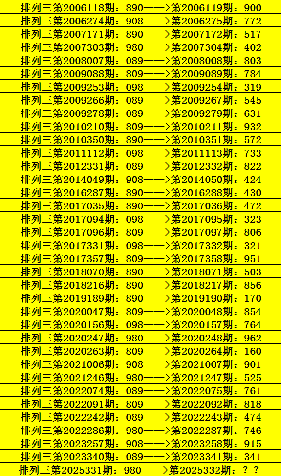 第2025331期排列三奖号为980,历史上该号码组选开出36次,下期奖号分别为:900、772、517、402、803、784、319、545、631、932、572、733、822、424、430、472、323、806、321、951、503、856、170、854、764、962、160、901、525、761、818、474、746、915、341。