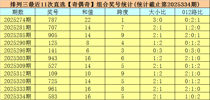 开奖回顾:排列三第2025334期开出奖号:583,类型为组六,和值为16,奇偶比为2:1,大小比为2:1,跨度为5。