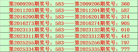 排列三第2025334期开出奖号583,该号码直选类型历史上出现了8次,前7次开出之后期下期奖号为:360、587、374、905、010、442、797,见下表: