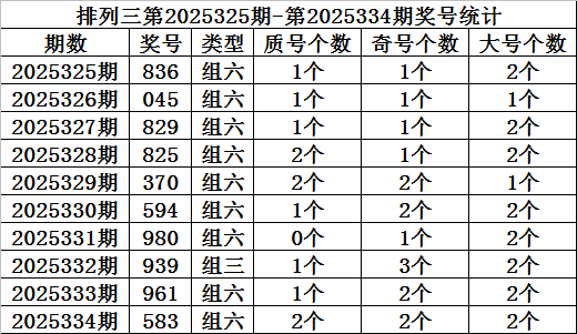 上期回顾:排列三第2025334期开奖:583,质合比为2:1,奇偶比为2:1,大小比为2:1。