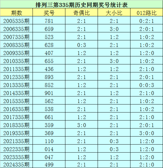 排列三第2025335期开奖日期:2025年12月15日,历史上第335期已开出了19次奖号,历年同期号码分别为:781、659、523、628、407、655、436、893、852、901、562、538、661、359、369、110、014、047、499。