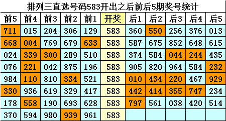 四、排列三直选号码583历史上开出8次,其前后五期奖号分别为: