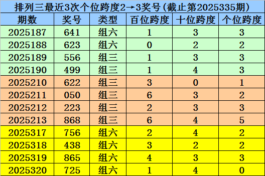 末位跨度分析:前3期末位奖号为1-3-6,最近两期末位奖号跨度为2、3,末位奖号跨度历史上连续两期开出2、3的现象共183次,其最近两次奖号为: