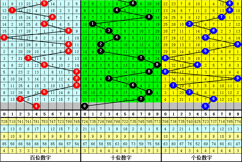 两码合开出频次分别为:1出现12个,0出现8个,5出现7个,2出现6个,3、7、9出现5个,4、6出现4个,8出现1个,其中历史同期两码合012路比开出22:21:14,大小比开出22:35,奇偶比开出34:23;