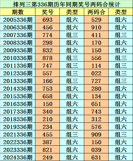排列三从2004年开奖至今已开出7459期奖号了,其中第336期历史同期奖号出现19次,历年第336期分别开出号码:693、456、774、298、832、878、747、557、166、753、658、150、340、210、234、455、387、821、249。