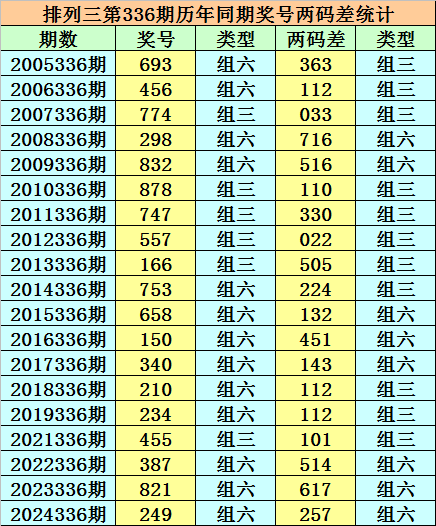 在排列三第336期历史同期开奖中,各号码两码差分别为:336、112、033、167、156、011、033、022、055、224、123、145、134、112、112、011、145、167、257;