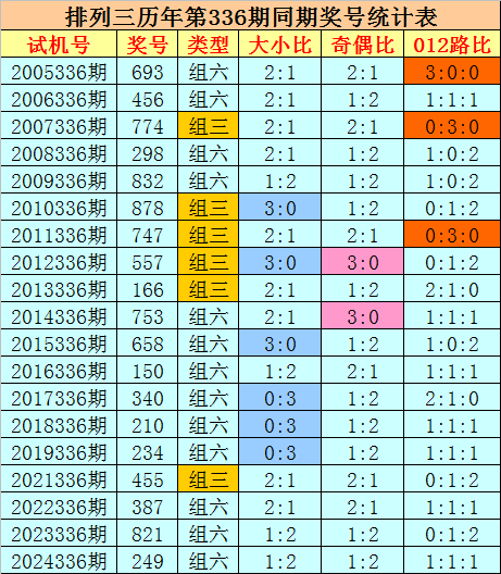 012路分析:历史上排列三第336期同期奖号中,012路奖号总个数比为17:19:21,012路奖号轮空期数比为6:4:5,今年第336期预计2路号码走冷轮空,看好012路比开出1:2:0。