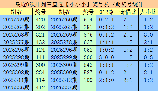 1.排列三第2025336期奖号开出412,大小直选分布为:小小小,在历史开奖中直选【小小小】分布已开出946期,在前9次直选【小小小】分布中,出现奖号为:420-202-321-432-124-141-300-234-114,组三开出4期,组六开出5期。