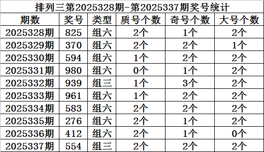 上期回顾:排列三第2025337期开奖:554,质合比为2:1,奇偶比为2:1,大小比为2:1。