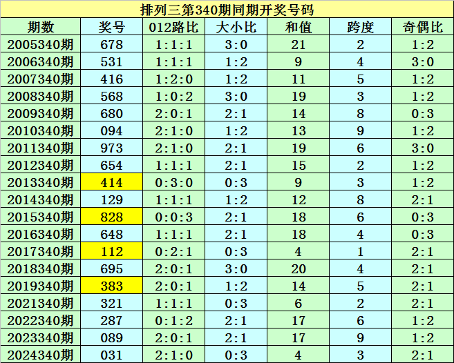 本期为排列三第2025340期开奖,开奖日期为:2025年12月20日,历史上排列三第340期已开出了19次奖号,历年同期开出号码分别为:678-531-416-568-680-094-973-654-414-129-828-648-112-695-383-321-287-089-031。