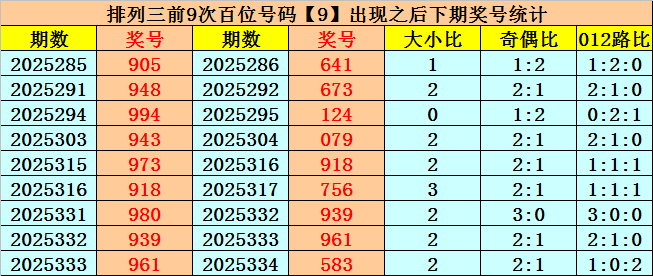 在百位前9次出现号码9之后,下期百位分别开出奖号:6-6-1-0-9-7-9-9-5,其中开出号码个数012路比是6:2:1,奇偶比是6:3,大小比是7:2。
