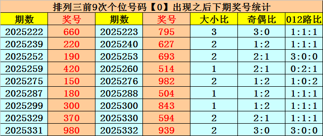 个位号码:上期奖号为小 号、偶数、0路号码:0,历史上个位号码0共开出707期,前一次出现在第2025331期,上期遗漏7期再出。