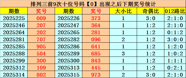 个位前9次开出号码0时,该位下期奖号分别为:5-7-3-4-2-4-3-4-9,其中号码个数大小比是3:6,012路比是3:4:2,奇偶比是5:4。