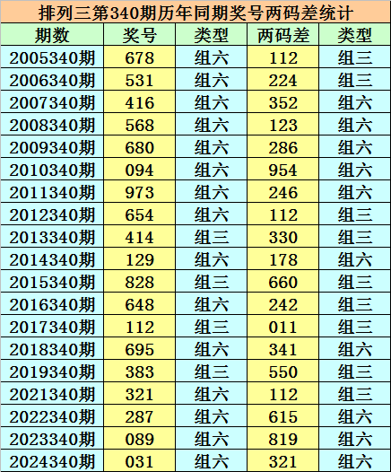 在排列三第340期历史同期开奖中,各号码两码差分别为:112、224、235、123、268、459、246、112、033、178、066、224、011、134、055、112、156、189、123;