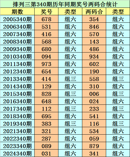 在历年同期中两码合开出年限分别为:4出现9年,0、3出现7年,1、5出现6年,6出现5年,8、9出现4年,2出现3年,7出现2年,第2025340期预计两码合出现:1、2、9。