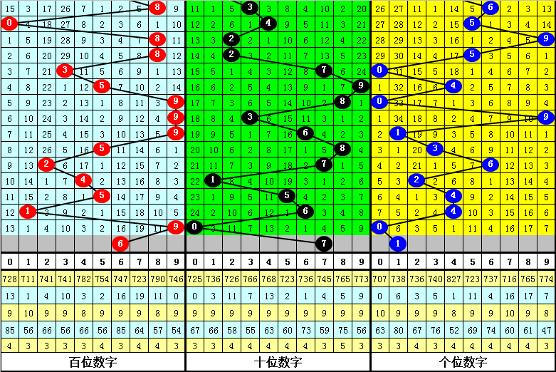 大中小分析:在组选0-9号码分布图中,前10期小 号(0-2区段)出现8枚奖号,中号(3-6区段)出现13枚奖号,大号(7-9区段)出现9枚奖号,上期中号区域没有落号,本期预计大中小区域各出1枚奖号。