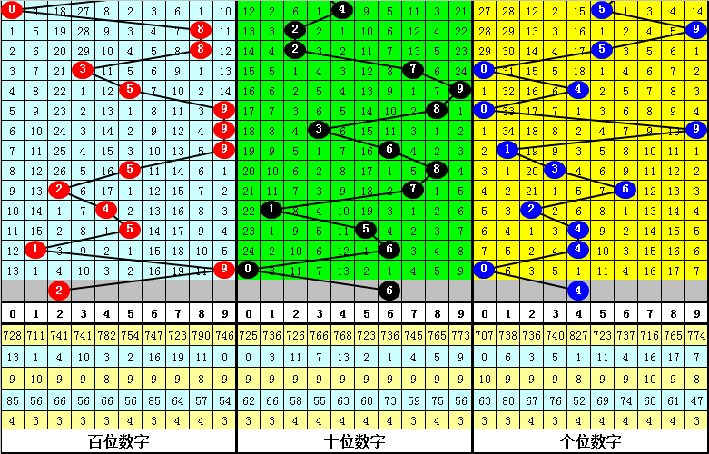 其中,百位奇偶比为9:5,大小比为5:9,本期百位一码参考2。