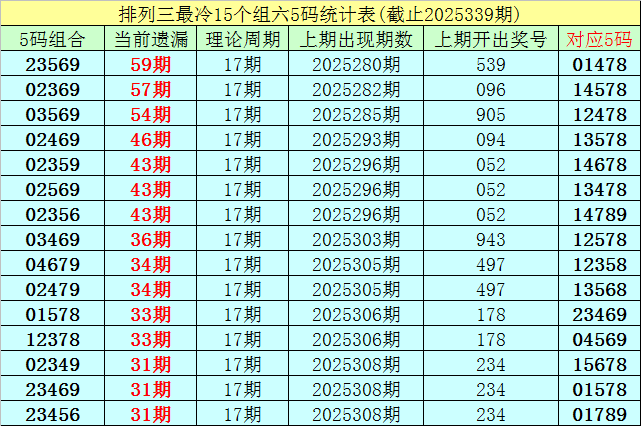 (5)排列三目前遗漏值最大的5码组六组合为:23569,本期遗漏59期,短期解冻的可能性较小,则25340期奖号分布在23569-01478之中的可能性最大。