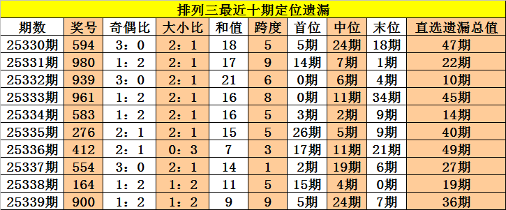 开奖回顾:排列三第2025339期奖号:900,定位直选遗漏值5期、24期、7期,遗漏总值为36期。