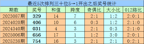 1、最近两期排列三十位号码开出号码分别为5和1,历史上十位号码连续两期同时出现号码5和1的奖号共开出73期。最近五次下期开出号码为:329、406、031、656、754;