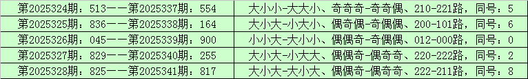 则,排列三第2025329期奖号:370,与排列三第2025342期奖号可能有相同的号码。且排列三第2025342期奖号大小比、奇偶比和012路比可以参考第2025329期奖号形态:小大小、奇奇偶和010路。