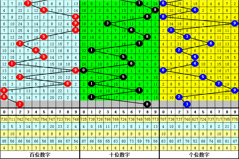3、在以上0-9号码频次中,号码奇偶比为43:32,大小比为34:41,本期预计百位开出小 号,参考号码2。