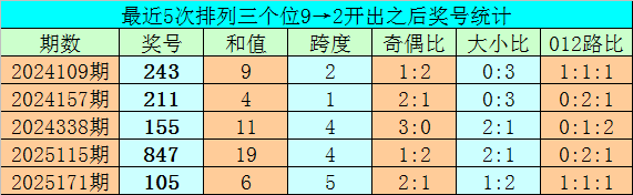 1、排列三前两期个位分别开出号码9和2,历史上个位号码连续两期分别出现9和2时,共有83次。在最近5次出现时,其下期分别出现号码:243、211、155、847、105;