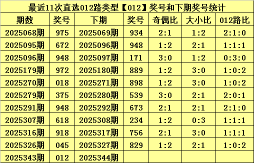 排列三上期开出奖号为:012,其直选012路类型为012,历史上直选012号码已开出了267次,最近11期分别开出奖号为:975、672、948、972、018、375、948、618、918、045、012。