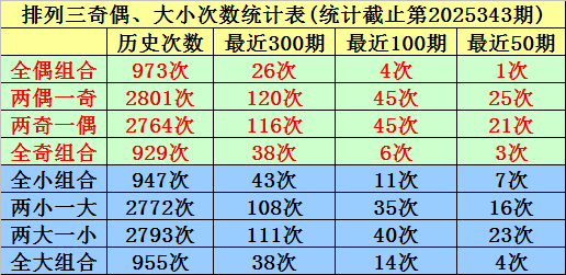 大小、奇偶分析:在连续40期奖号中,两大一小出现21期,当前遗漏1期、全大出现4期,当前遗漏20期、全小出现4期,当前遗漏0期、两小一大出现11期,当前遗漏4期,本期看好开出两小一大;两奇一偶有21次,目前遗漏1期、全奇有3次,目前遗漏11期、全偶有1次,目前遗漏29期、两偶一奇有25次,目前遗漏0次,本期预计出现全偶。