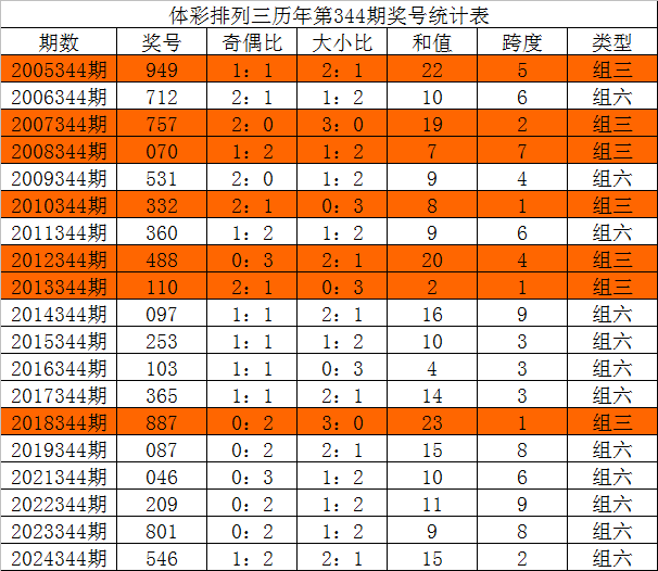 体彩排列三历年第344期开出奖号分别为:949、712、757、070、531、332、360、488、110、097、253、103、365、887、087、046、209、801、546。统计详见下表: